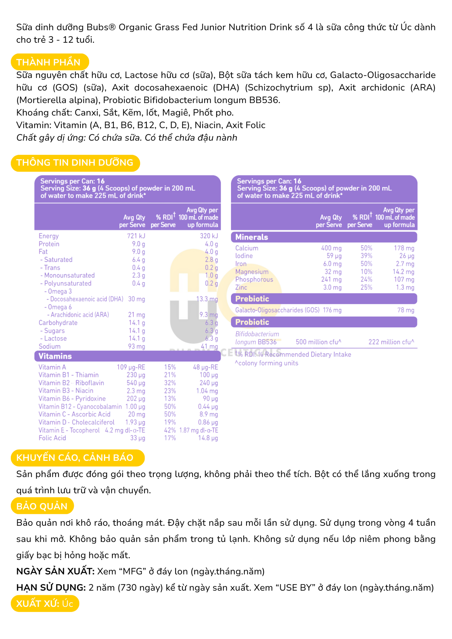 Sữa dinh dưỡng Bubs Organic Grass Fed Milk Growing Up Nutrition 600g