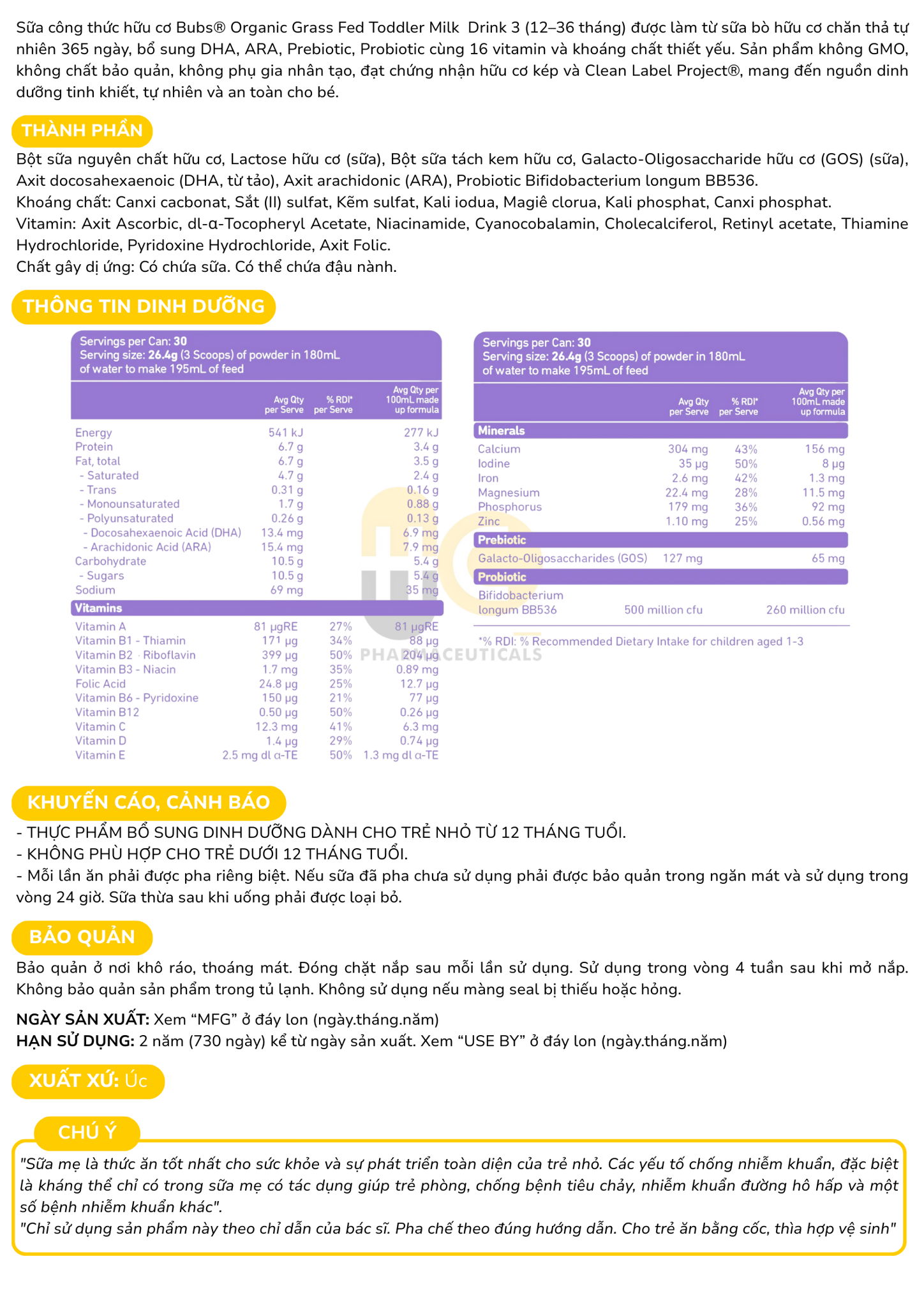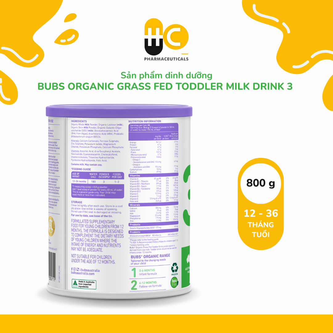Sữa dinh dưỡng công thức Bubs Organic Grass Fed Toddler Milk Drink 3